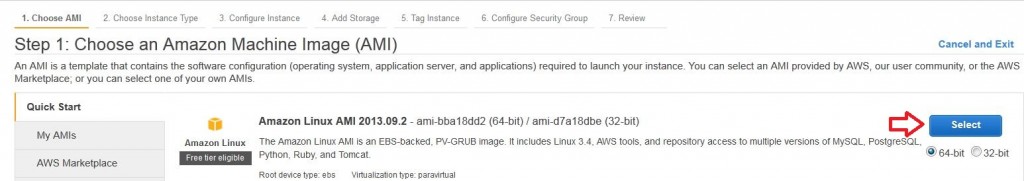 3. You’ll be directed to a new window where to choose an Amazon Machine Image (AMI), select the Amazon Linux (Amazon Linux AMI 2013.09.2 – ami-bba18dd2 ) as seen below.5 - Amazon Linux
